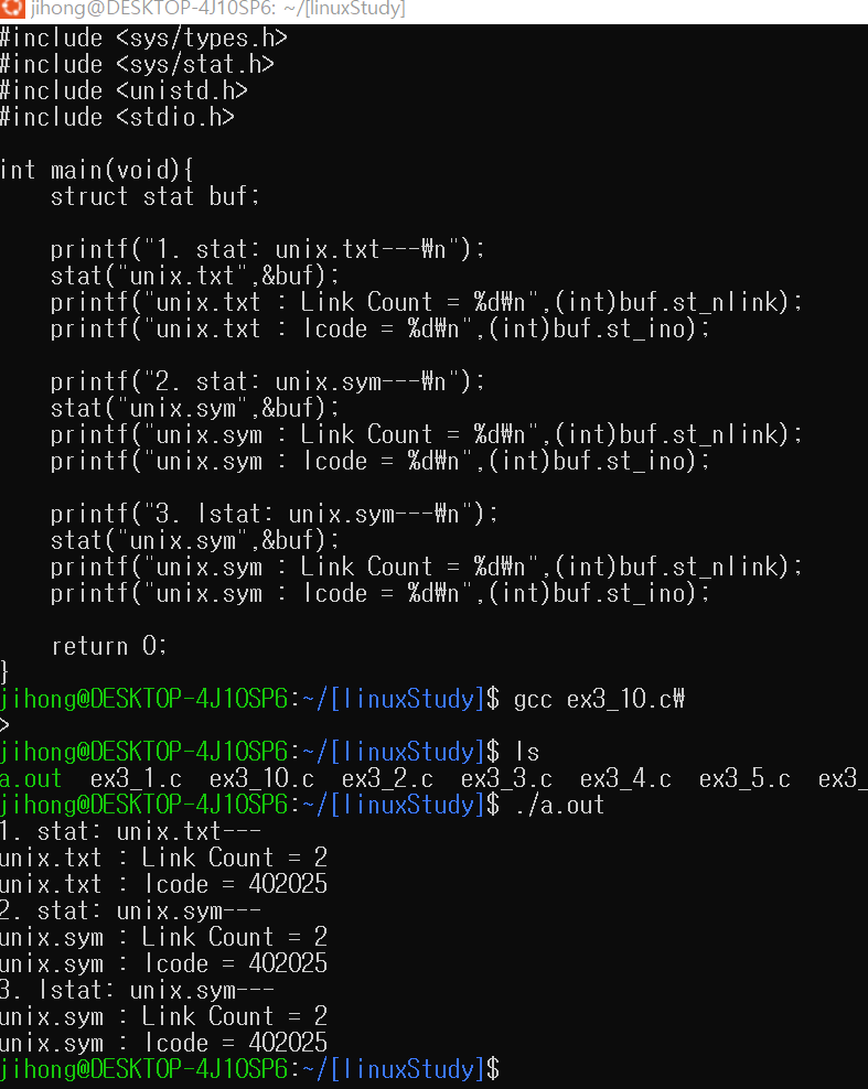 int lstat(const char *path심볼릭 링크의 경로 , struct stat *buf검색한 파일 정보를 저장할 구조체 주소)