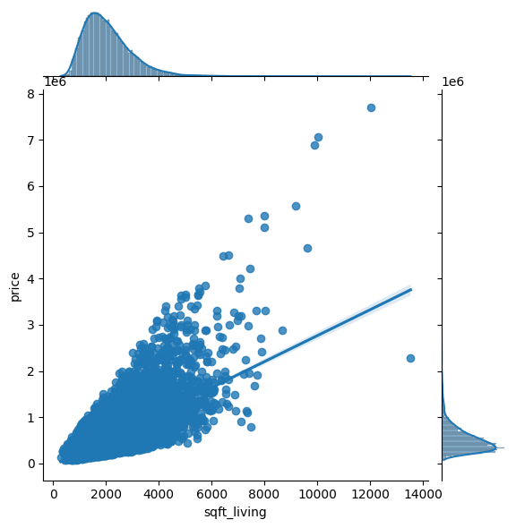 sns.jointplot(x='sqft_living', y='price', data=df, kind='reg')