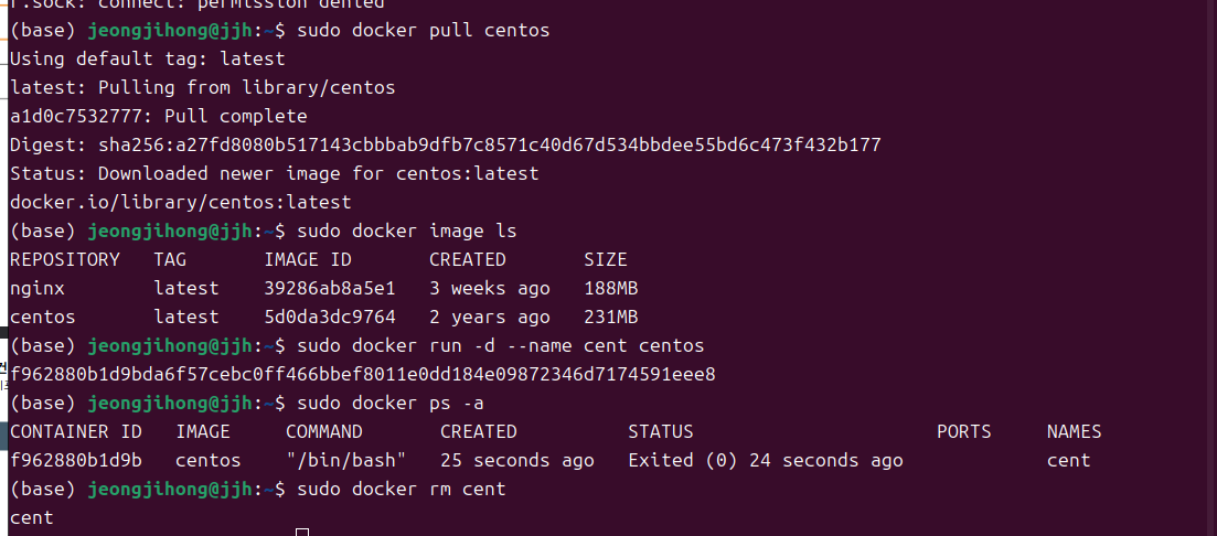 - docker rm cent 해당 이름을 가진 컨테이너 삭제