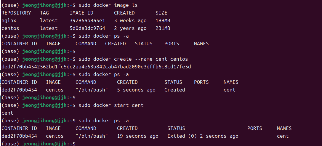 - docker ps -a => 이미지가 성공적으로 실행되고 종료되었음을 보여준다. (Exited (0) ) cent컨테이너는 별다른 작업을 안하니 종료됨.