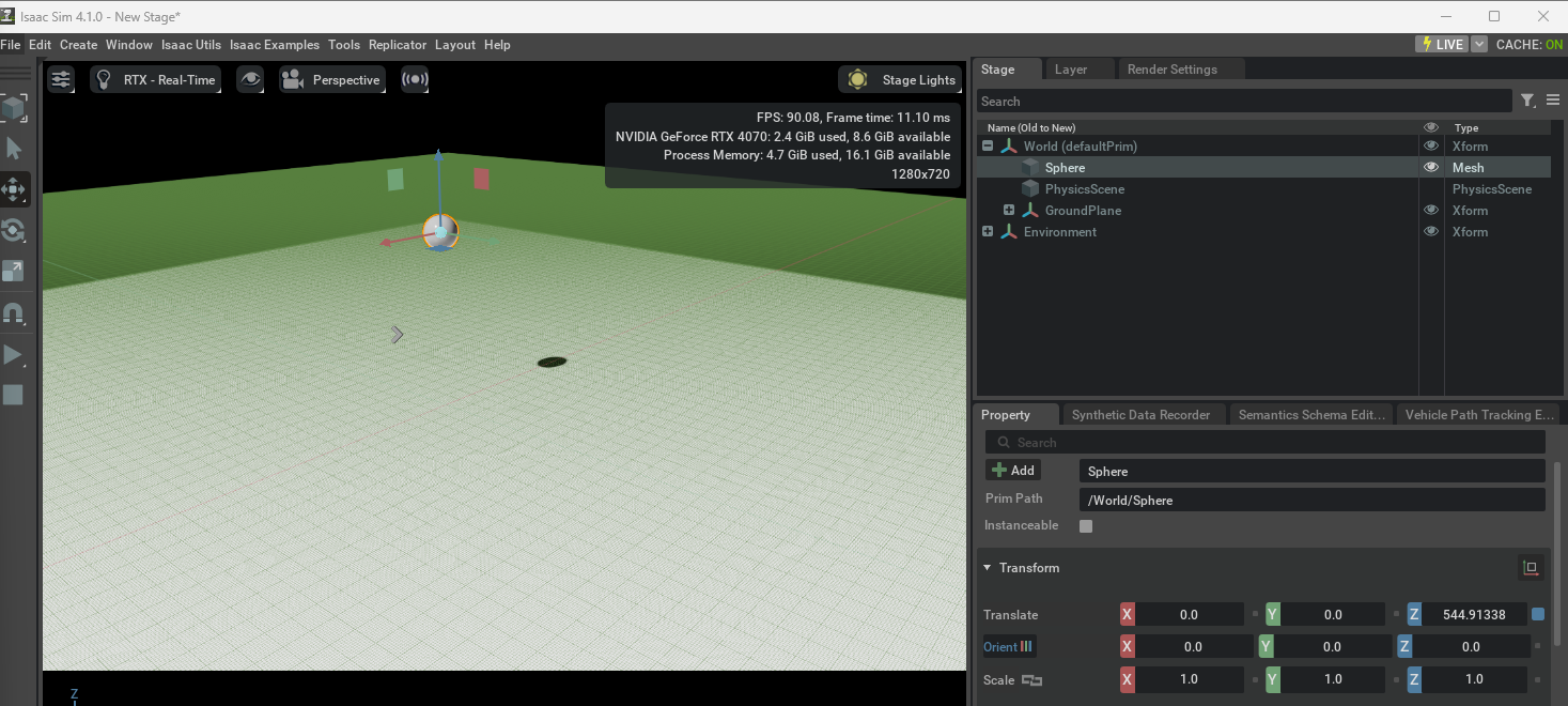 - 우선 구를 z축으로 위로 올려준다. 그리고 play버튼을 누른다.