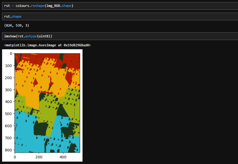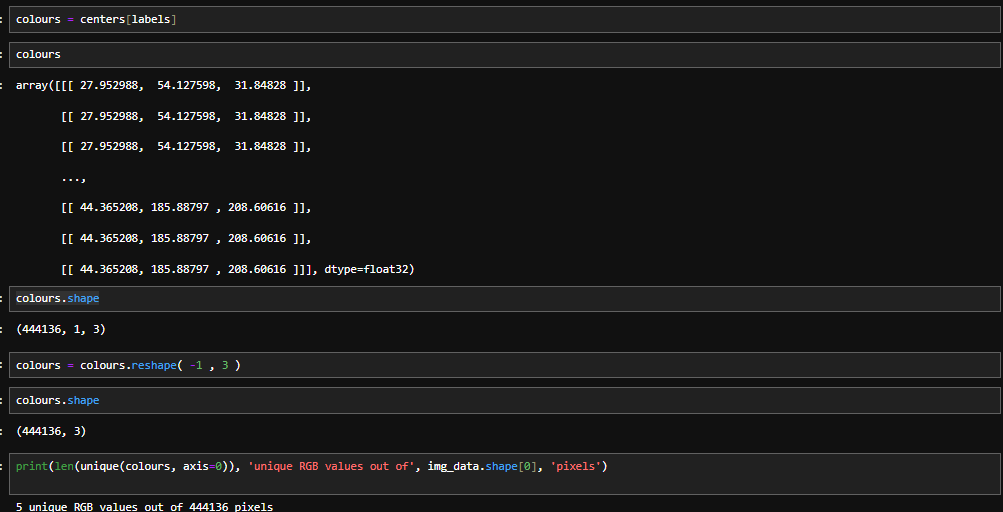 - 1. k-means 클러스터링을 사용하였으며, 총 5개의 클러스터로 rgb값을 분류하였다.