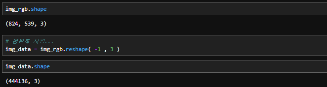- 2. 그리고 처리를 위해서 reshape( -1 , 3 )으로 평탄화를 시킴