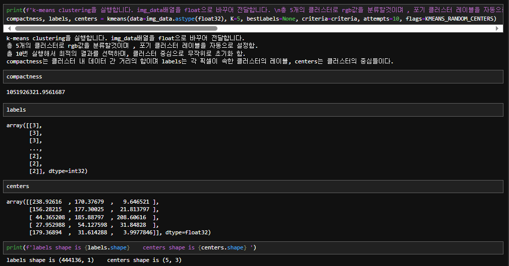 - 4. centers는 각 레이블에 대한 색상값이다. 나중에 출력할 이미지는 해당 5가지중 1가지로만 표한할 것이다.