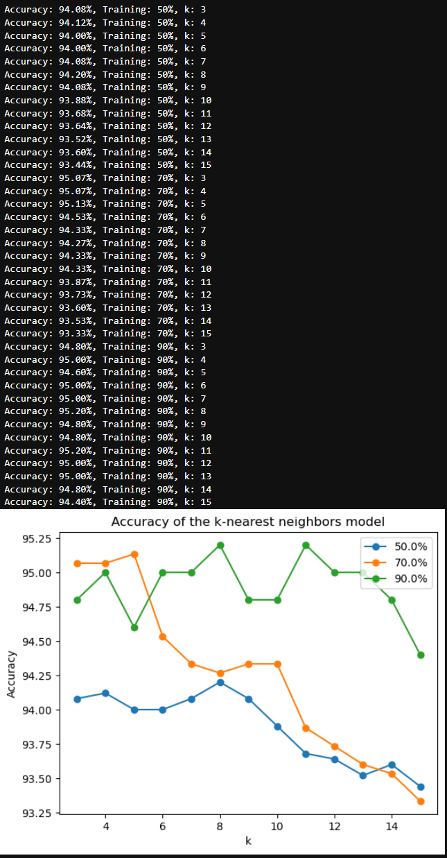 - 위의 그래프는 k값에 따른 정확도 비율을 나타낸다.