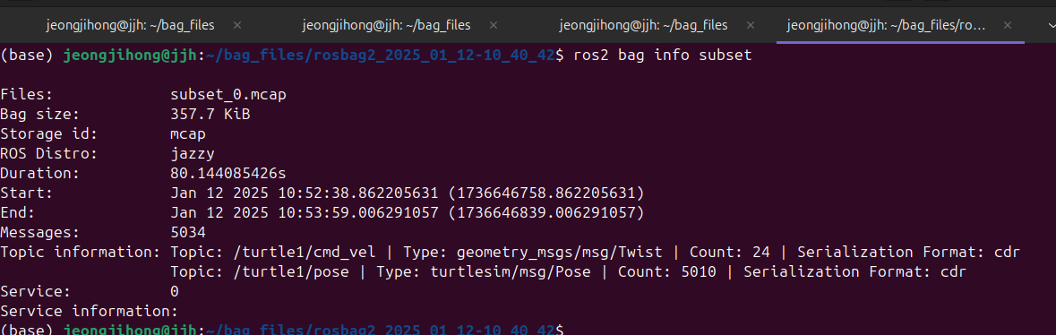 - -o옵션은 bag file에 고유한 이름을 지정할 수 있게 해준다. 아래의 명령어는 subset의 이름으로 저장하는 것이다.