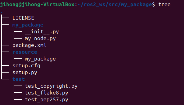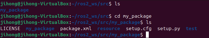 - ros2_ws/src/my_package안에는 ros pkg create 명령어로 자도적으로 생성된 파일과 폴더들이 존재한다.