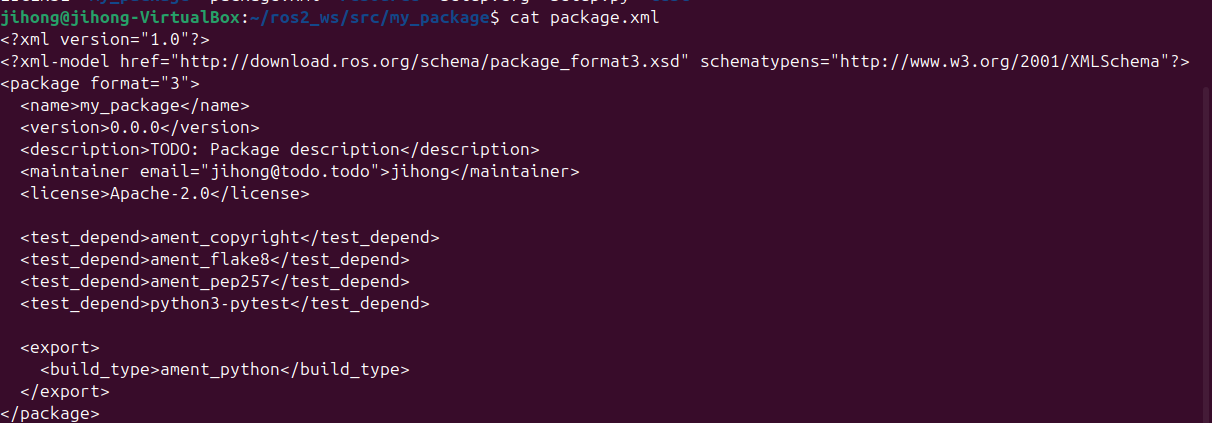 - license의 아래에는 _depend로 끝나는 태그들이 있으며, 이는 패키지의 다른 패키지 의존성을 나열하는 곳으로, colcon이 검색할 수 있게 한다.