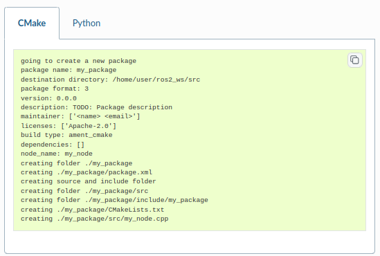 ros2 pkg create --build-type ament_cmake --license Apache-2.0 --node-name my_node my_package