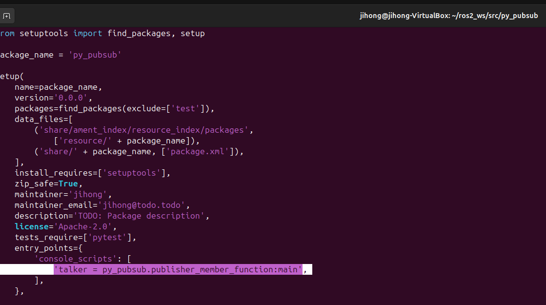- 우선 ros2_ws/src/py_pubsub으로 가자. 그리면 setup.cfg 와 setup.py 와 package.xml이 있을거임
