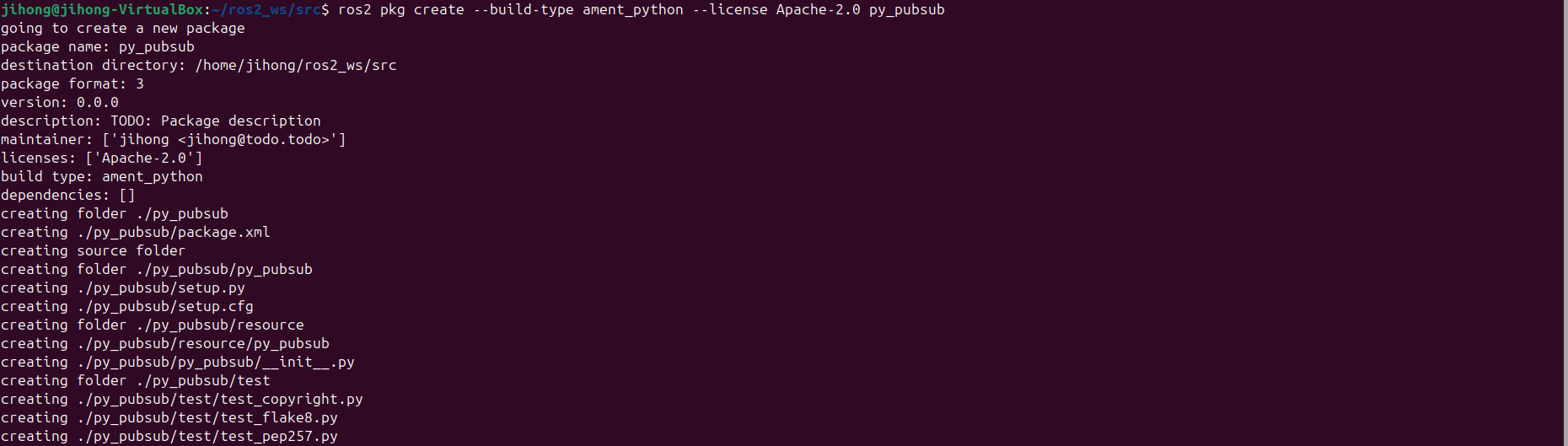 ros2 pkg create --build-type ament_python --license Apache-2.0 py_pubsub
