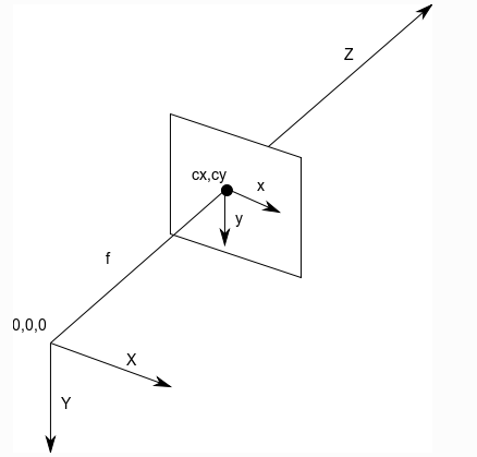 - 렌즈의 중심이 원점이며, 카메라 정면 방향을 Z축, 카메라의 아래쪽을 Y축 , 카메라의 오른쪽을 X축으로 잡는다.