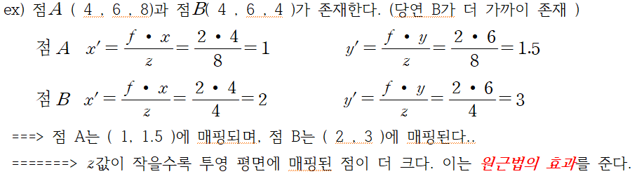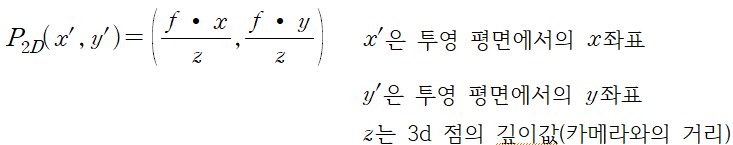 - 실제 3D공간에서의 점을 사용하여, 투영 평면에 매핑하려면???