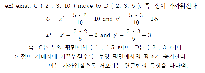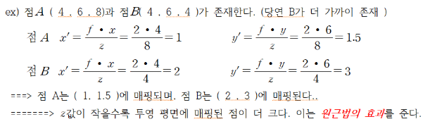 - z가 작다면 x' , y;은 커진다... 즉, 가까이 있는 물체는 커보임