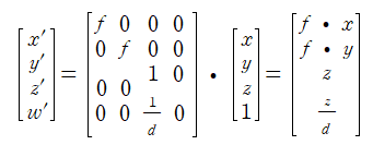 - 투영 행렬과 입력 벡터를 곱하면 [ f*x , f*y , z , z/d ] 와 같다.