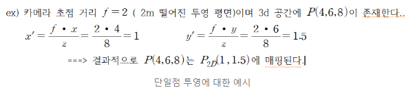 - 원근 투영은 3d 점을 2d점으로 변환하는 것이다. 이 변환은 행렬 연산으로 표현 가능