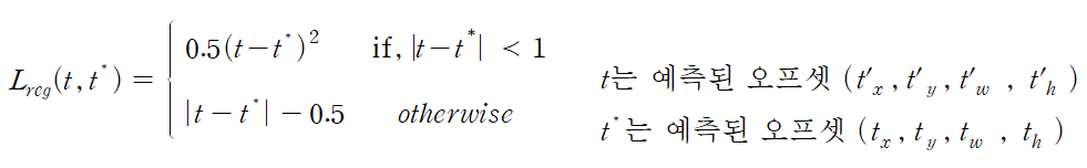 - bounding box regression loss는 주로 Smooth L1 Loss로 정의한다. ( 식1참고)