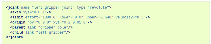 - left_griper_joint는 joint의 이름이며, 타입은 revolute이다.