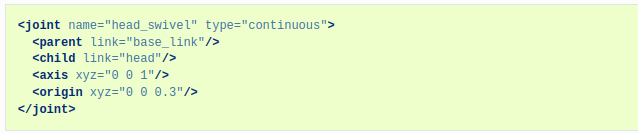 - 해당 joint의 이름은 head_swivel이며, 타입은 continuos이다.