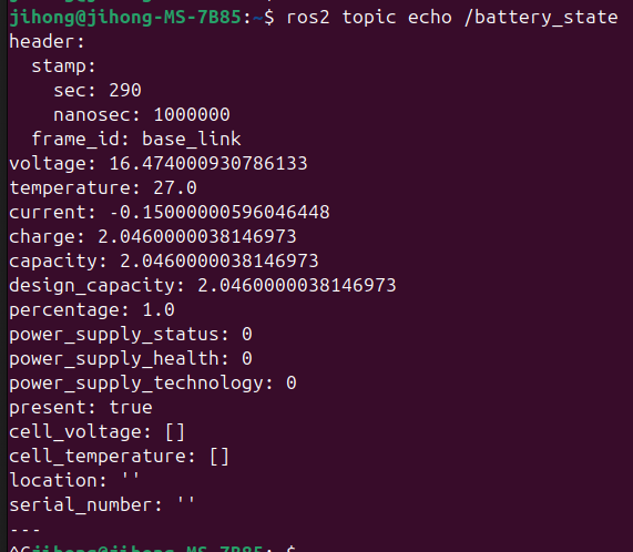 - /battery_state : 배터리의 현재 상태(전압, 전류 등)를 나타냄