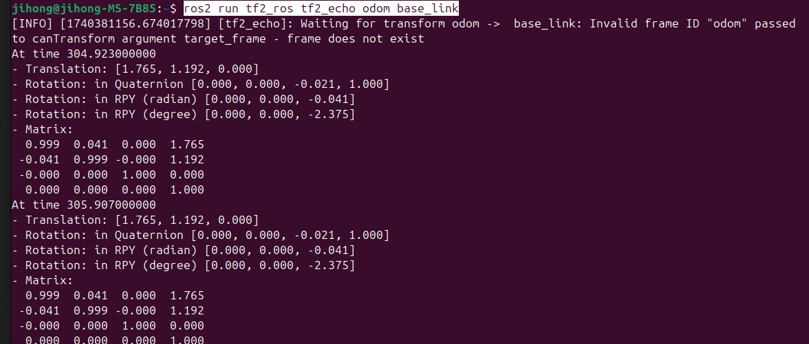 - turtlebot의 현재 위치와 자세를 나타내는 4x4 변환 행렬이다.