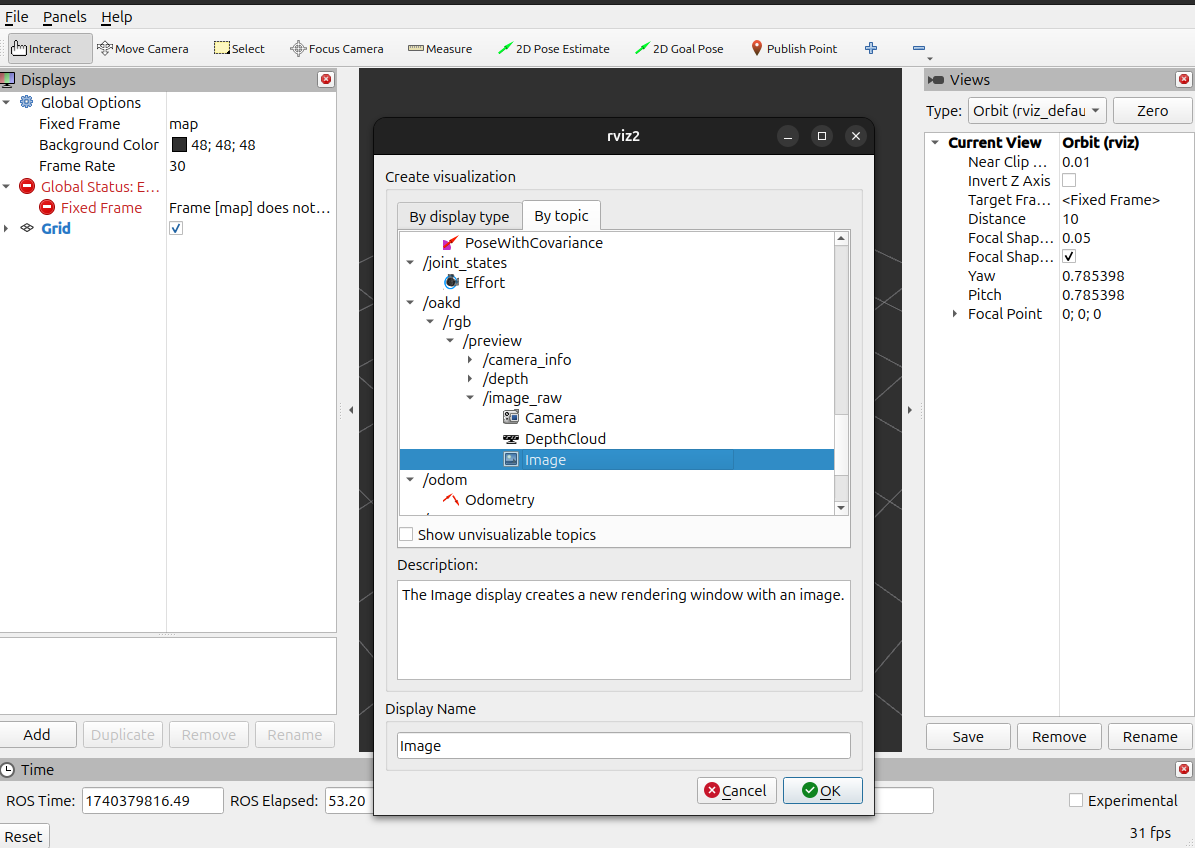 4, add -> by topic -> oakd -> rgb/preview/image_raw에서 image선택