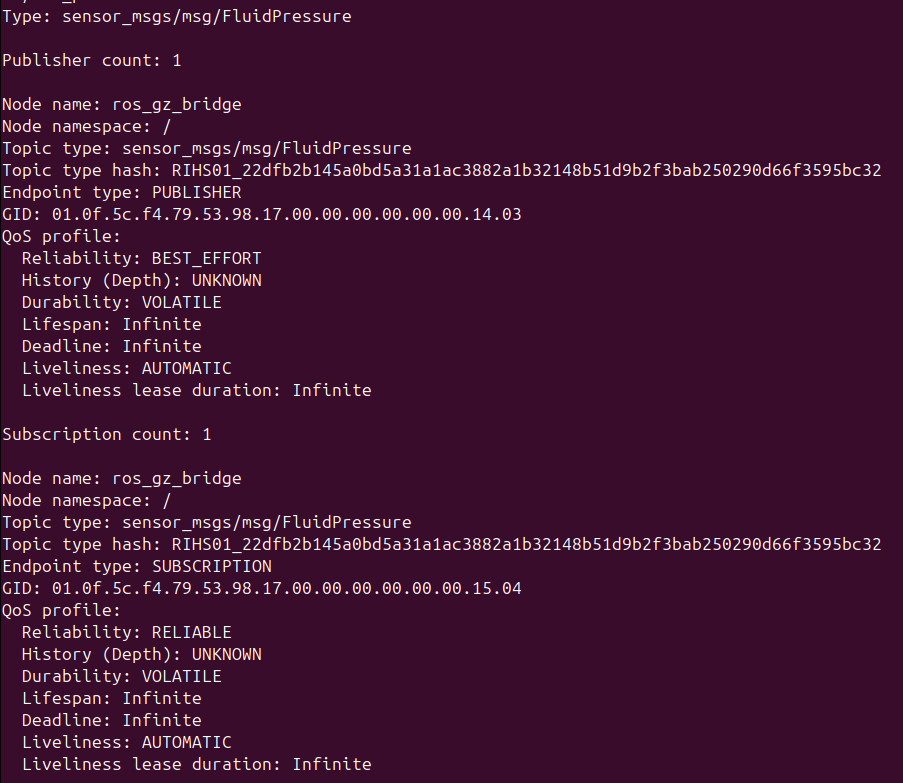- 이는 /air_pressure 토픽에서 ros2와 gazebo간의 QoS정책이 일치하지 않아서 메시지가 전달되지 않는 문제다.