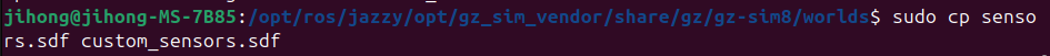 - 1. /opt/ros/jazzy/opt/gz_sim_vendor/share/gz/gz-sim8/worlds에 존재하는 sensors.sdf는 내가 만든 것이 아니다. 그래서 수정하는 방식보다는 cp를 해서 할거다. 위의 디렉토리에서 cp를 해주자... ( 사진 1 참고 )