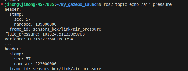 - 3-2. 위의 예제에서 공기 압력 센서는 gazebo에서 작동하며, ROS2 토픽을 통해서 데이터를 publishing할 것 이다.