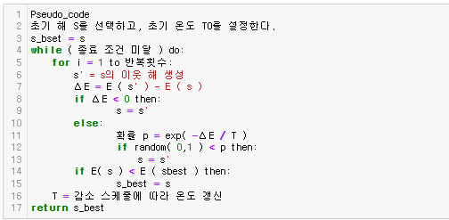 - 3. 현재의 해에서 약각의 변화를 주어서 새로운 이웃 해 s'을 생성한다. ( 이웃해 생성 방법은 문제의 특성에 따라서 다양하게 설계됨. )