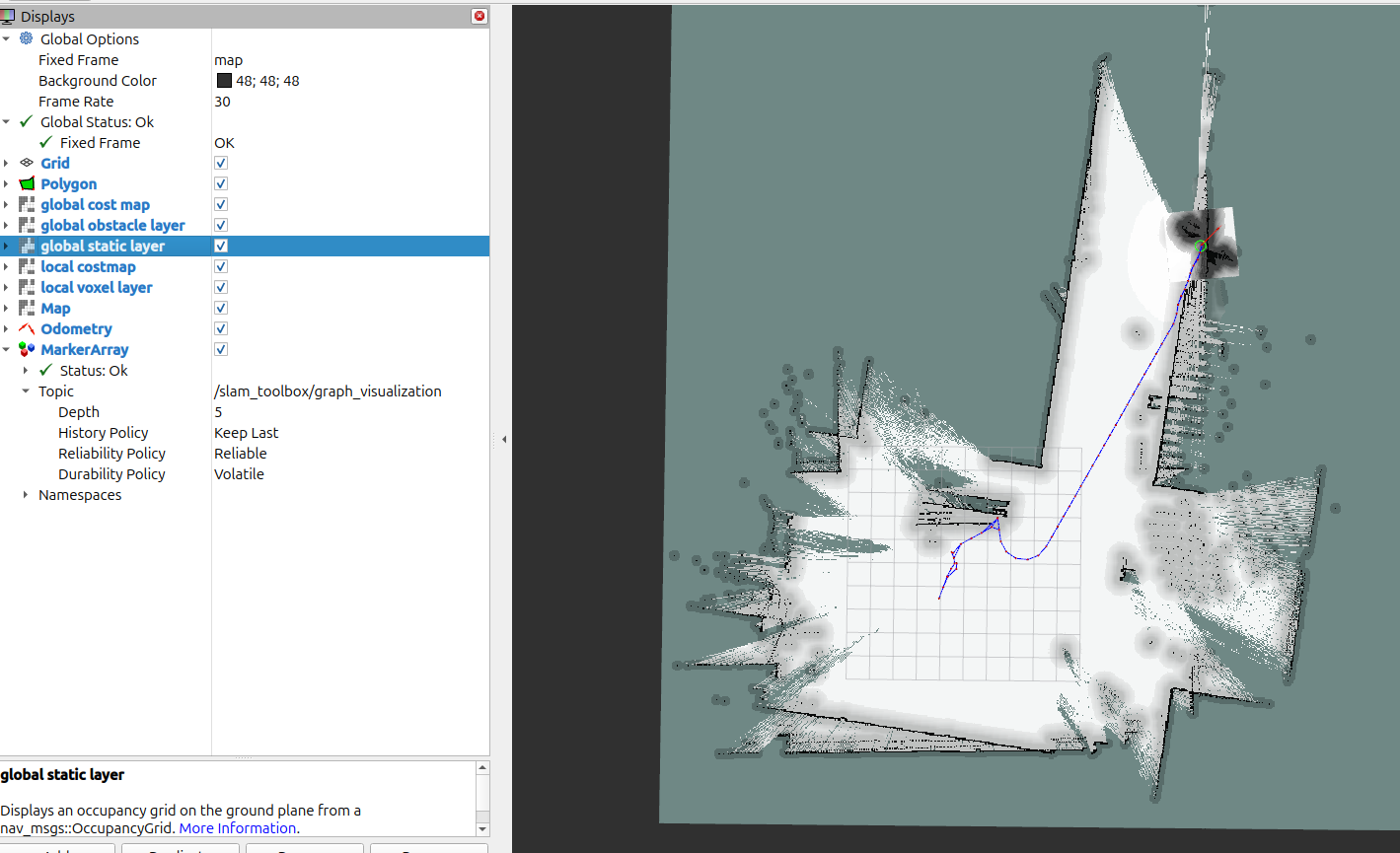 2- Launch SLAM Bring up your choice of SLAM implementation. Make sure it provides the map->odom transform and /map topic. Run Rviz and add the topics you want to visualize such as /map, /tf, /laserscan etc. For this tutorial, we will use SLAM Toolbox. ros2