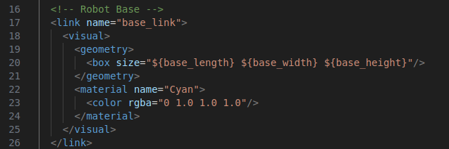 - 우선 로봇 본체의 크기를 정의한다. base_link의 가로 세로 높이이다.