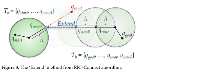 - T_a쪽에서는 q_newA와 q_start가, T_b에서는 T_a로 확장하는 과정에서는 q_near와 q_goal, 그리고 q_newB와 q_goal이 순차적으로 리와이어링된다.