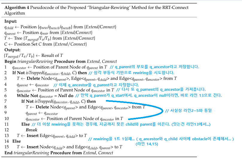 - ‘Triangular-Rewiring’은 RRT-Connect의 ‘Extend’와 ‘Connect’단계에서 새로운 노드가 삽입될 때마다 호출된다.