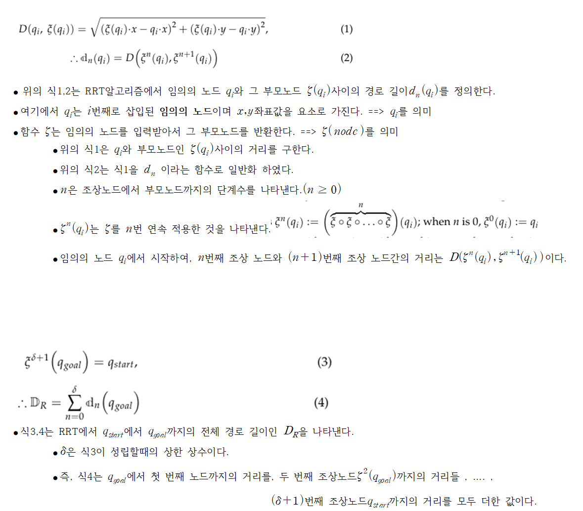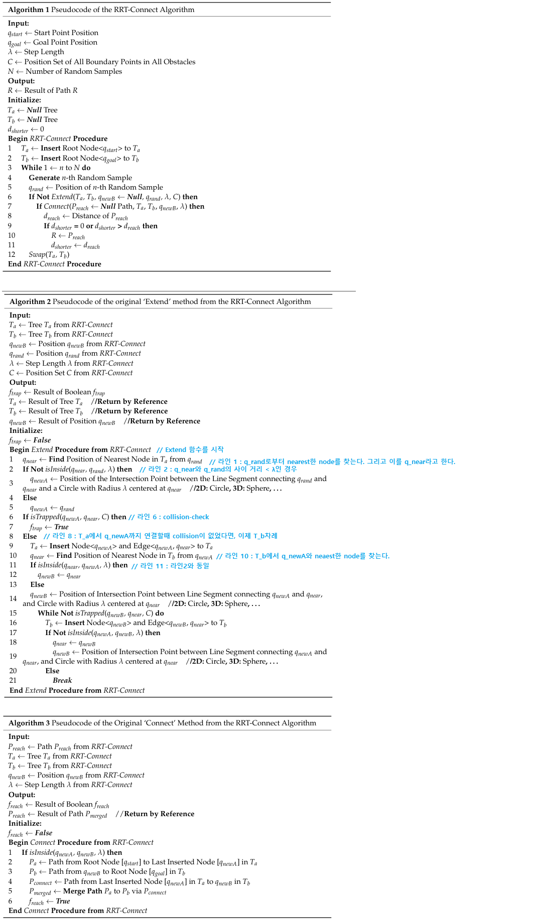 - 2장에서는 RRT 알고리즘을, 3장에서는 RRT-Connect 알고리즘을 소개하며, 4장에서는 삼각부등식 기반 RRT-Connect 알고리즘을 제안한다.