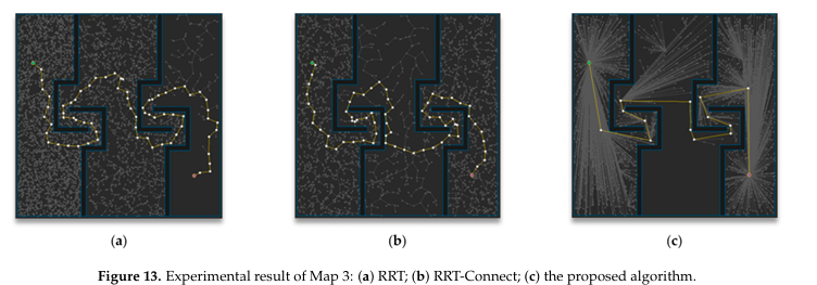 - 그림 1-a의 RRT는 트리 구조로 확장되는 과정을, 그림 1-b의 RRT-Connect는 출발점과 목표점에서 확장된 두 트리가 서로를 향해 확장되어 연결되는 과정을, 그림 1-c의 제안 알고리즘은 경로 계획 중 RRT-Connect에 삼각부등식 기반의 리와이어링을 적용한 과정을 나타낸다.