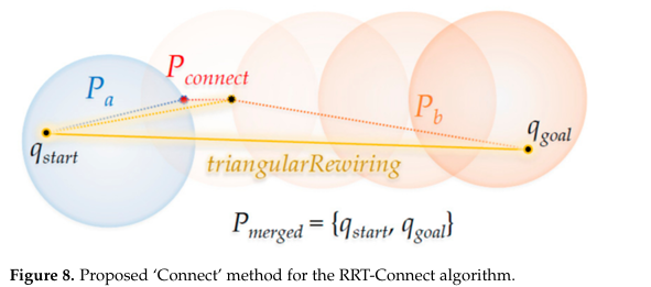 - 그림 8은 RRT-Connect의 ‘Connect’ 메서드(그림 4)에 ‘Triangular-Rewiring’을 적용한 예시를 보여준다.