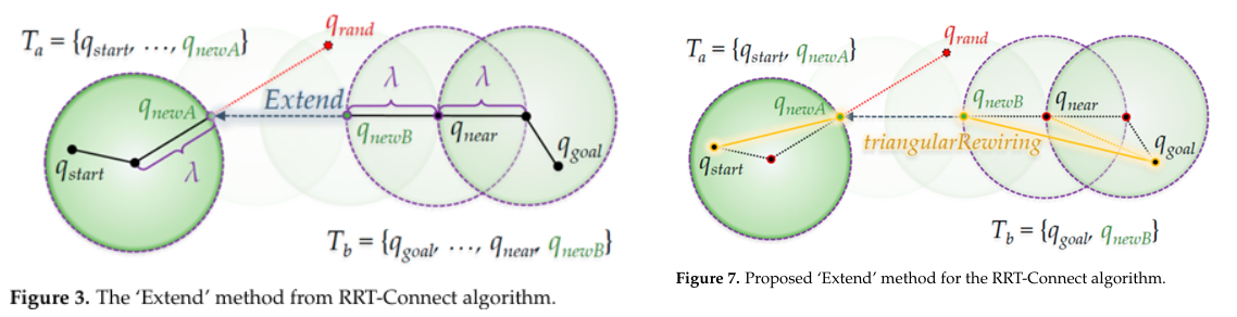 - 그림 7은 'RRT-Connect 알고리즘의 ‘Extend’ 메서드를 보여주는 그림 3'에 ‘Triangular-Rewiring’ 기법을 적용한 과정을 나타낸다.
