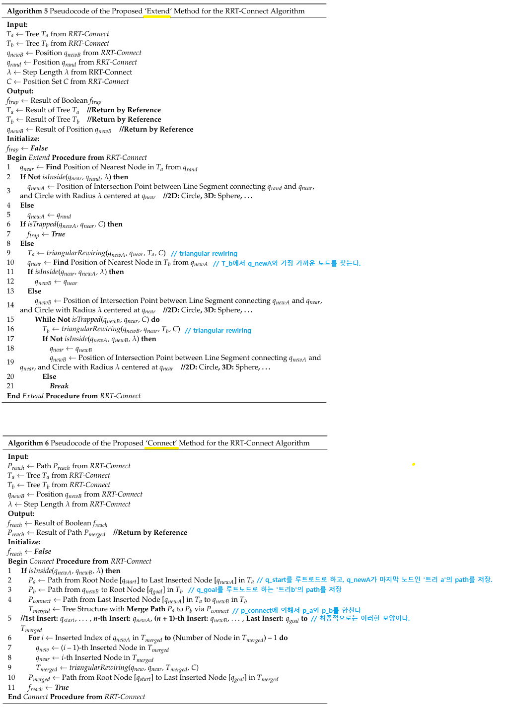 - 구체적으로, 제안된 기법은 3장에서 소개한 RRT-Connect 알고리즘의 주요 절차인 ‘Extend’ 메서드와 ‘Connect’ 메서드에서 새로운 노드를 트리에 삽입할 때마다 적용된다.