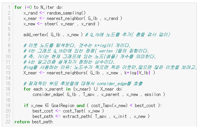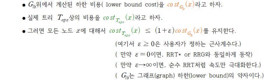 - 현재 트리의 경로 비용이 최적 비용보다 특정 오차 ε 이내에 있도록 유지합니다. (ε-approximate optimality)