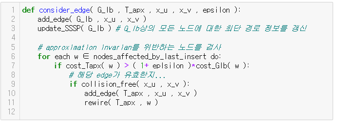 - G_lb에서는 충돌 검사 없이 모든 잠재적 엣지( u , v )를 추가하여, 오직 T_apx에 엣지를 실제로 사용할때만, 해당 edge에 대해서 collision-free검사를 수행한다.