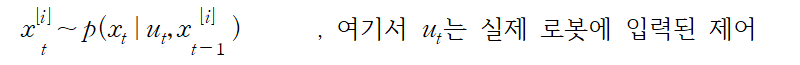 ~는 "~로부터 샘플링하다" or "~라는 분포를 따른다"라는 의미다. 여기서는 "i번째 파티클의 새로운 상태"는 "이전 상태 x_t-1"와 "입력 u_t"로 정의된 "모션 모델 확률 분포"에서 샘플링한 값이다.라는 의미