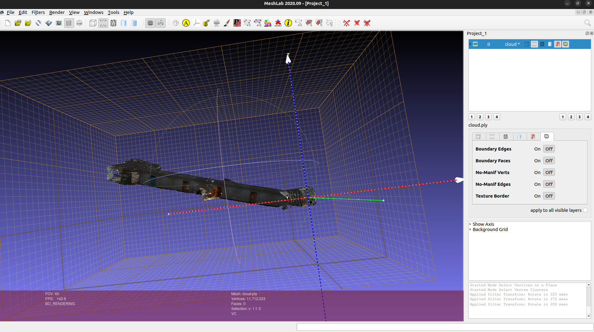 - 만약에 보이는 축을 변경하고 싶다면, filters에서 Normals, Curvatures and Orientation 선택한다. 그리고 Transform: Rotate 선택한다. 2번째 사진은 x축을 90도 회전한것이다.