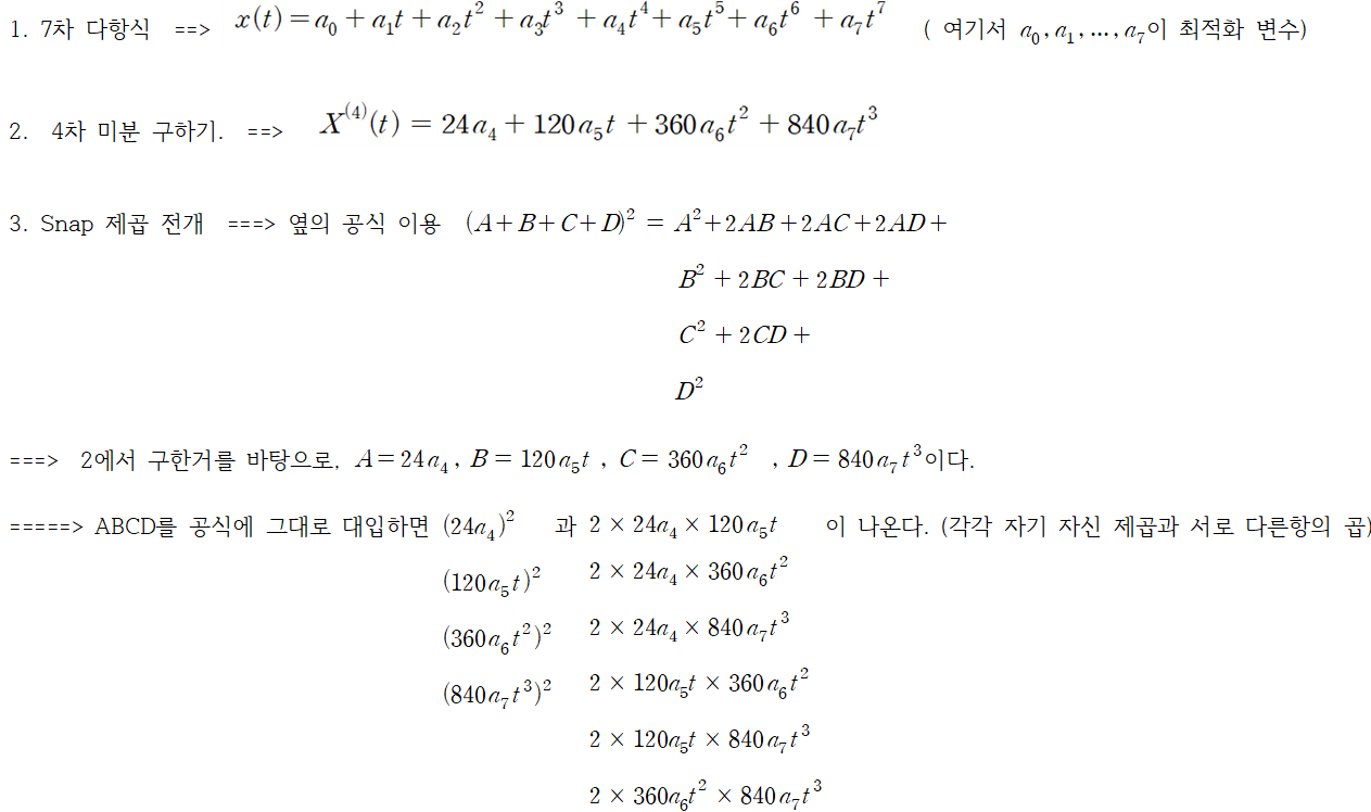 - snap이 크다는 것은 "가속도가 갑자기 또 크게 바뀐다"는 의미이니, 궤적의 고차원 부드러움을 더 엄격히 제어하려면, snap까지 최소화하는 것이 유리하다.