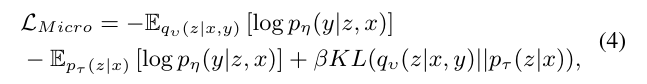 - 학습–테스트 간 재구성 차이를 줄이기 위해 [7,36]을 따라 prior 분포로부터의 추가 reconstruction loss를 제공한다. 따라서 β-weighted ELBO [16]를 사용하는 Micro-stage의 학습 loss는 다음과 같다.