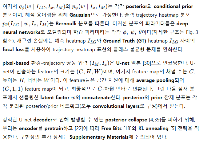 - Fig. 3과 같이, 과거 trajectory 에 조건화된 prior p(z∣x)를 두고, 이는 미래 trajectory 에 대한 posterior latent distribution p(z∣x,y)를 근사하도록 학습된다. 테스트 시에는 p(z∣x)p(z\mid x)에서 latent factor zz를 샘플링하여 p(y∣z,x)p(y\mid z,x)를 예측한다.