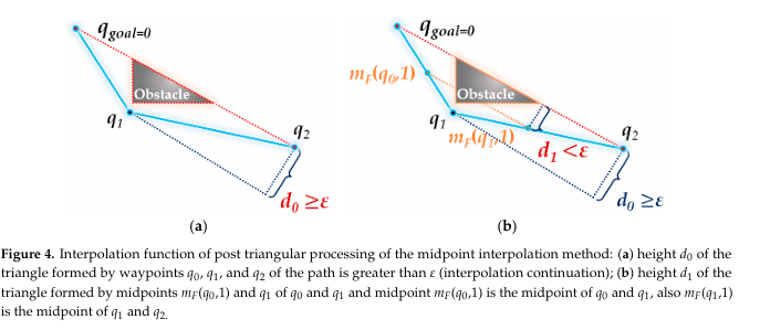 - 제안하는 midpoint interpolation method의 post triangular processing은 RRT처럼 optimality를 보장하지 않는 경로 계획 알고리즘들에 적용할 수 있으며, triangular inequality 원리에 기반한 rewiring과 midpoint interpolation을 이용한다.