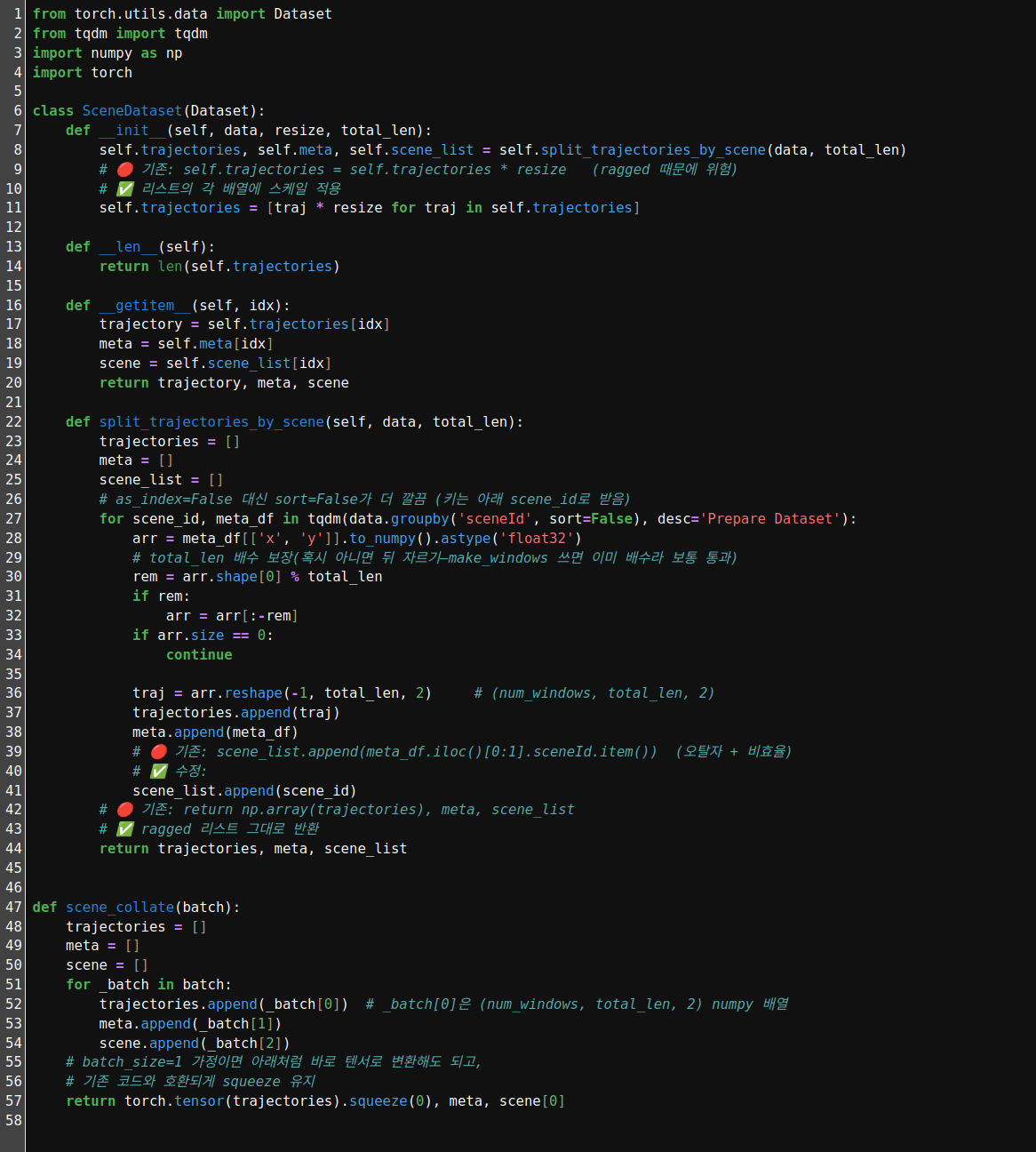 - 즉, SceneDataset에서 꺼낸 ' 하나의 ( trajectory , meta , scene_name)'를 DataLoader가 넘겨줄때, 원하는 모양의 텐서 + 메타데이터로 정리해주는 함수.
