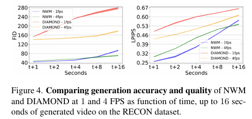4 FPS와 1 FPS 설정에서 NWM의 예측이 DIAMOND보다 유의미하게 더 정확함을 보여준다. - 초반에는 NWM 1 FPS 변형이 더 좋은 성능을 보이지만, 8초가 지나면 누적 오차와 컨텍스트 손실 때문에 예측이 악화되고, 그 시점부터는 4 FPS 설정이 더 우수해진다.