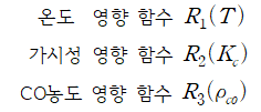 - 또한 세 요인과 대피 속도 간의 관계를 나타내기 위해 온도 영향 함수 , 가시성 영향 함수 , CO 농도 영향 함수를 도입한다(Xu et al., 2022).